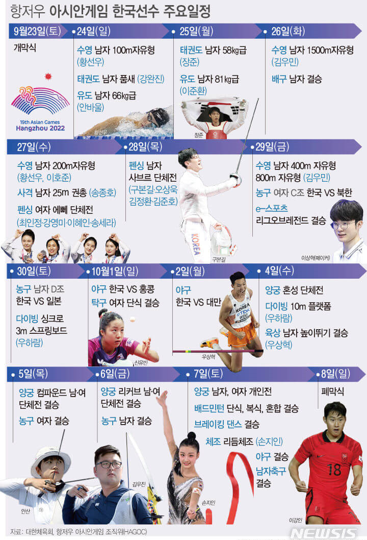 항저우 아시안 게임 한국선수 주요 경기 일정