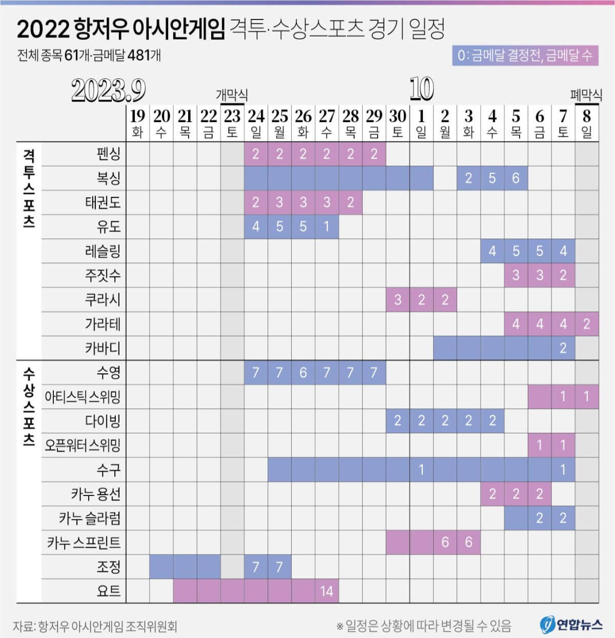 항저우 아시안게임 격투.수상스포츠 경기 일정